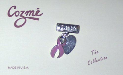 The traditional pink ribbon with a silver heart hanging from the word "Faith"