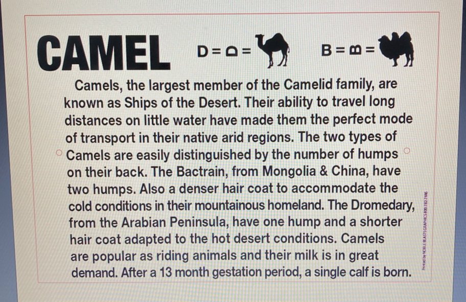 Camel Information Sign Camels, the largest member of the Camelid family, are known as Ships of the Desert. Their ability to travel long distances on little water have made them the perfect mode of transportation in their native wild regions. The two types of camels are easily distinguished by the number of humps on their back. The Bactrain, from Mongolia and China, have two humps. Also a denser hair coat to accomodate the cold conditions in their mountainous homeland. The Dromedary, from the Arabian Pennisula, have one hump and a shorter hair coat adapted to the hot desert conditions. Camels are popular as riding animals and their milk is in great demand. After a 13 month gestation period, a single calf is born. Size: 12" x 18" Item #: NB146XXX Price: $27.00 |