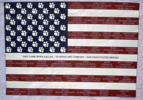 Canine Heroes T-shirt Celebrate the heroism of the dogs that helped search for survivors on 9/11. The stars of the flag are paw prints and in the stripes are the names of some of the dogs that helped during 9/11, their breed type, and where they were from. Color: Ash Sizes: S only 1 left in stock Item #: AACH Price: $16.95 |