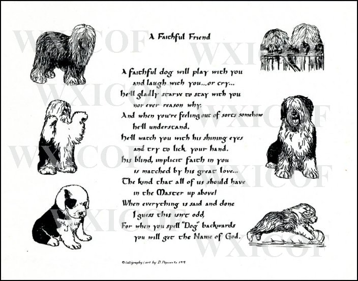 | Old English Sheepdog Print "A Faithful Friend" This delightful poem is printed on sturdy white card stock, ready to be framed. Size: 8.5" x 11" Item #: POP1 Price: $1.00 | |