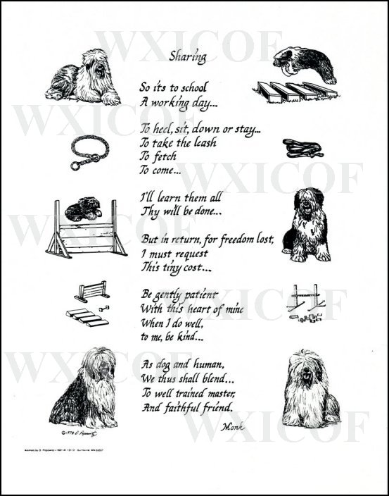 ![]() Click on image for larger size (WXICOF is not printed on the print you will receive) | Old English Sheepdog Print "Sharing" This delightful poem is printed on sturdy white card stock, ready to be framed. Size: 8.5" x 11" Item #: POP3 Price: $1.00 |