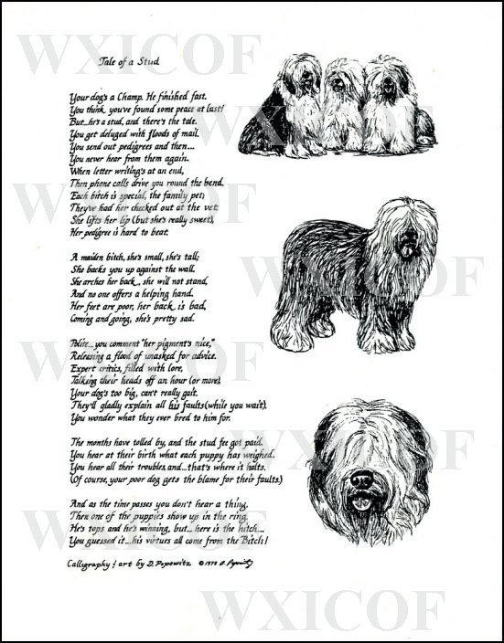 Click on image for larger size (WXICOF is not printed on the print you will receive) | Old English Sheepdog Print "Tale Of A Stud" This delightful poem is printed on sturdy white card stock, ready to be framed. Size: 8.5" x 11" Item #: POP2 Price: $1.00 |
