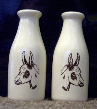 Porcelain Salt & Pepper Shaker Set Milk Bottle Style Spotted Baby Donkey Head Size: 5" tall Item #: 1400MBSP Price: $8.95 WXICOF Exclusive! Discontinued, Only 1 Left |