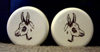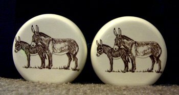 Porcelain Salt & Pepper Shaker Set Stove Top Style Original Donkey Family Size: 4" round Item #: 1800STSP Price: $11.95 WXICOF Exclusive! |