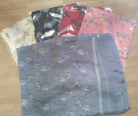 Zebra Print Scarf Zebras on a colored background Large lightweight scarf, 100% polyester Colors Available: Black, Red Sorry, All other colors SOLD OUT Size: 70" x 80" Item #: G182 Price: $18.95 |