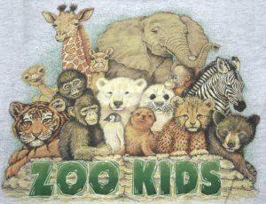 Zoo Mates Kids T-Shirt Giraffe, elephant, ostrich, gorilla, chimp, tiger, camel, polar bear, penguin, oragutan, walrus, sea lion, cheetah, black bear 98% cotton Color: Ash Kids Sizes Only: 2-4, 6-8, 10-12, 14-16 Item #: HQZM Price: $12.00 |
