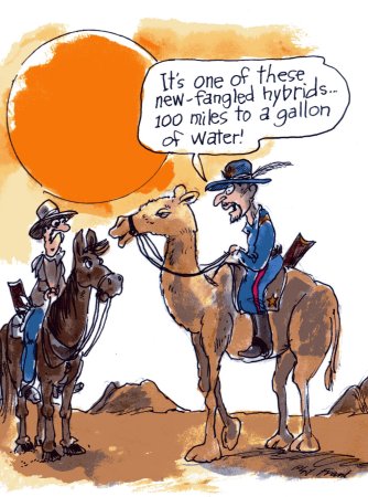 Outside: It's one of those new-fangled hybrids. 100 miles to a gallon