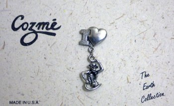 I Love Monkeys Pin A small monkey dangling off a heart. Size: 1½" from top of heart to bottom of monkey Color: Silver Item #: CZ6953 Price: $3.95 |