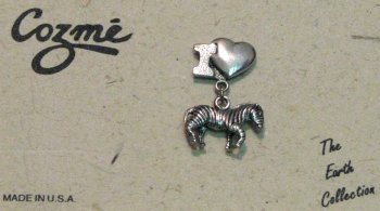 I Love Zebras Pin A small zebra dangling off a heart. Size: 1½" from top of heart to bottom of zebra Color: Silver Item #: CZ6957 Price: $3.95 |