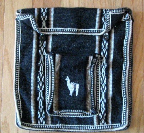 Knitted handbag with front zippered pocket and strap. Inside is lined. In natural colors.
