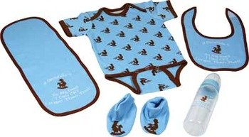 Combo pack includes: onesy, bib, pad, booties, and a bottle.