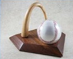 Arch Bat Holder Proudly display your collectible basbeall in this unique baseball holder. Your baseball will be completelty enclosed in a plastic sphere for protection, and it will sit on a wooden base, or homeplate, made of walnut. Behind the ball is a wooden baseball bat curved in the form of the famous St. Louis Arch. Made in the USA Size: Home plate is approx 7¼" wide and the Arch stands approx 5 ½" high Item #: RCCL06 Price: $54.95 |