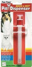 Four Paws Pill Dispenser For Pets This convenient pill dispenser is the quickest and easiest way to administer oral medications to dogs, cats, and other small animals . Designed and recommended by veterinarians, the Quick & Easy Pill Dispenser maximizes control and ensures a controlled dosage. Item #FP01915 $3.49 |